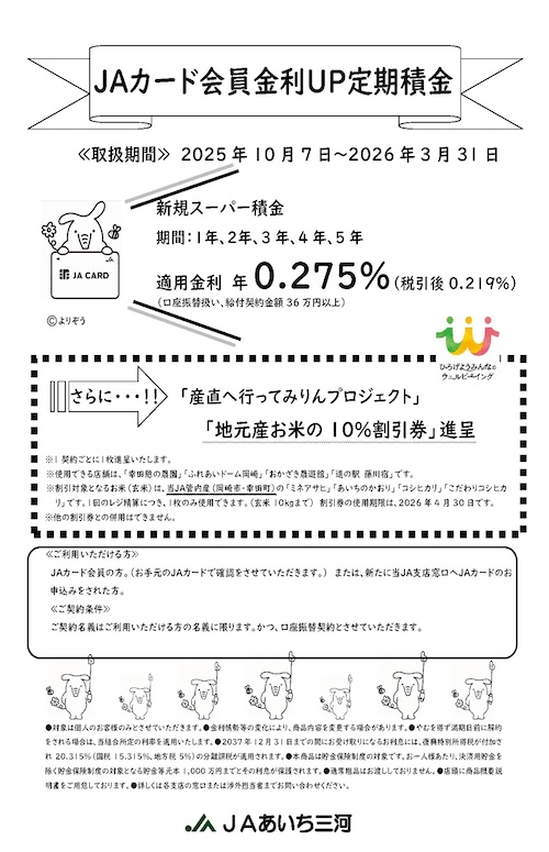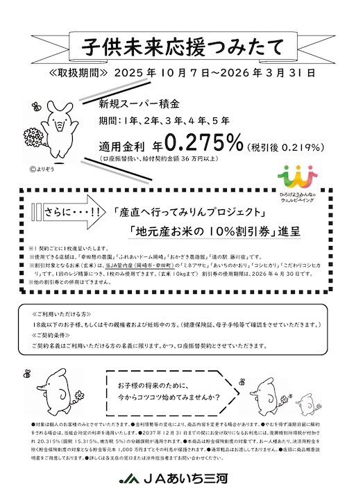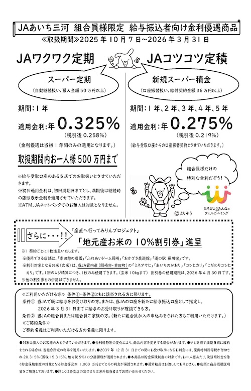 対象定期積金をご契約いただいた方に、当JAの産直店舗<4店舗>で使える地元産お米の10%割引券をプレゼント。