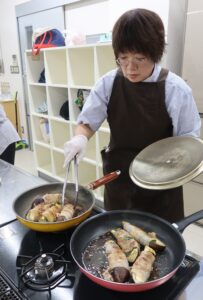 写真=調理する食育ソムリエ(13日、同JA本宿調理室)